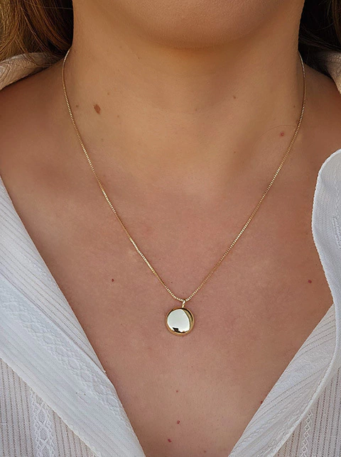 Colar botão dourada. Acessório moderno e minimalista.